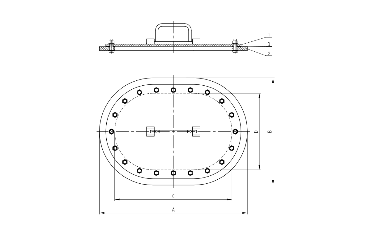 Die Hauptkomponenten umfassen eine Stahlabdeckplatte und einen Deckring mit einer Neoprendichtung zum Versiegeln. Befestigungselemente bestehen aus Stahlhex -Kopfschrauben, Sechskantmuttern aus Edelstahl und Messinger, um Korrosion an kritischen Punkten zu verhindern.